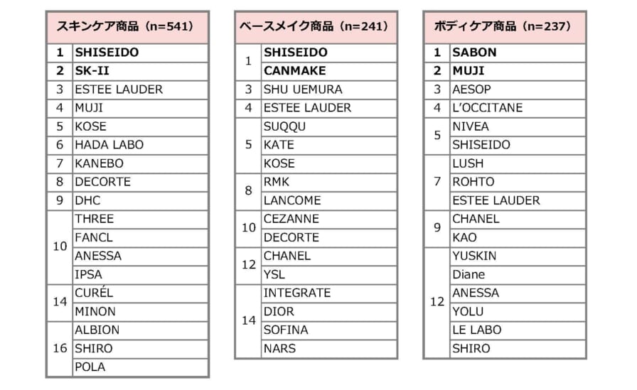・資生堂が全6カテゴリーのうち「スキンケア商品」「ベースメイク商品」「ヘアケア商品」で1位。「ベースメイク」はCANMAKEと同率1位。