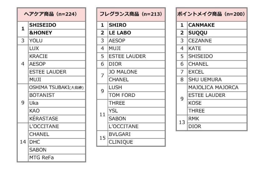 ・無印良品が「スキンケア商品」で4位、「ボディケア商品」は2位、「フレグランス商品」で4位、「ヘアケア商品」で他4ブランドとの同率4位。