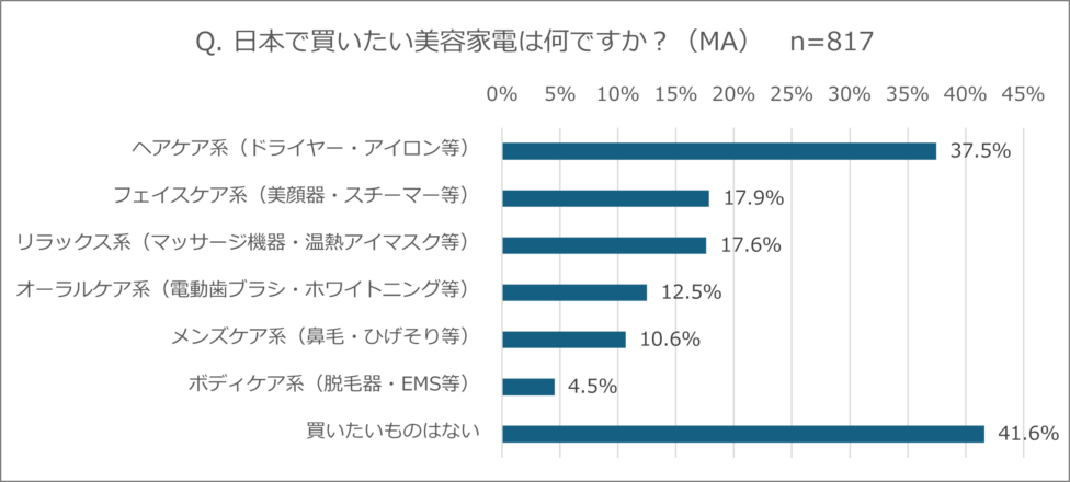 回答者全員に、日本で買いたい美容家電について聞きました。複数回答形式で質問したところ、1位は「ヘアケア家電」で37.5%でした。2位は「フェイスケア家電」(17.9%)、3位はマッサージ機器などの「リラックス家電」(17.6%)でした。また、「買いたいものはない」との回答が41.6%だったことから、全体の半数以上となる58.4%が「日本で美容家電を買いたい」ことが示されました。