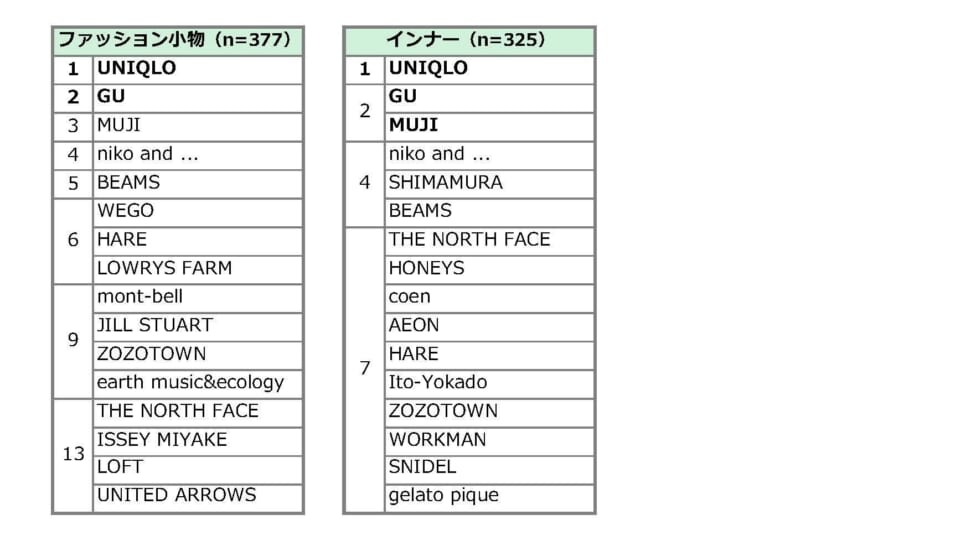 ・しまむらが「インナー」でニコアンドやBEAMSと同率4位、「トップス・ボトムス・ワンピース」でMOUSSYやSNIDELと同率の13位。