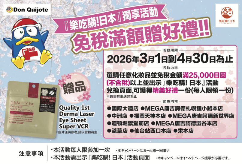 本キャンペーンは、2026年3月1日から4月30日までの期間、対象10店舗にて実施され、免税購入者を対象に25,000円(税抜)以上のお買い上げで人気フェイスマスクシリーズ「Quality 1st Derma Laser Eye Sheet Super VCR」をプレゼントする施策です。